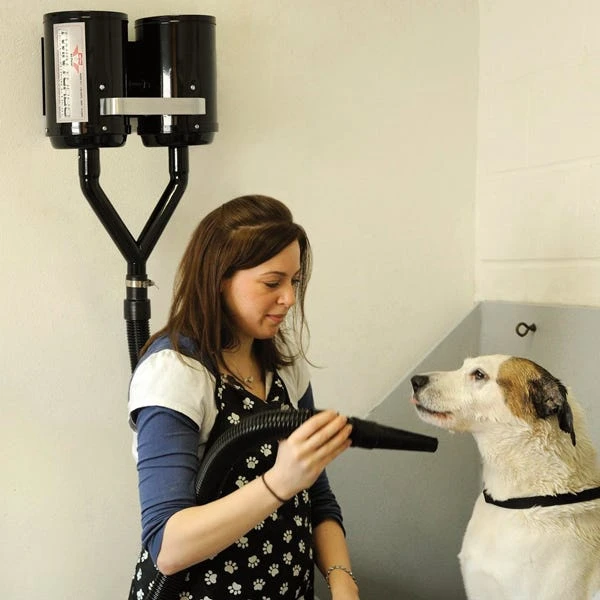 Cut drying time with this powerful Model TT-2X4 Air Force® Twin Turbo Super High Velocity Pet Dryer. Features two speeds and is powered by two 26,370 RPM motor turbines that deliver 61,000 FPM of air flow. Includes 10 ft 1.5″ diameter heavy duty hose, heavy duty blower nozzle, and air flare. Conveniently mounts to your salon wall.
